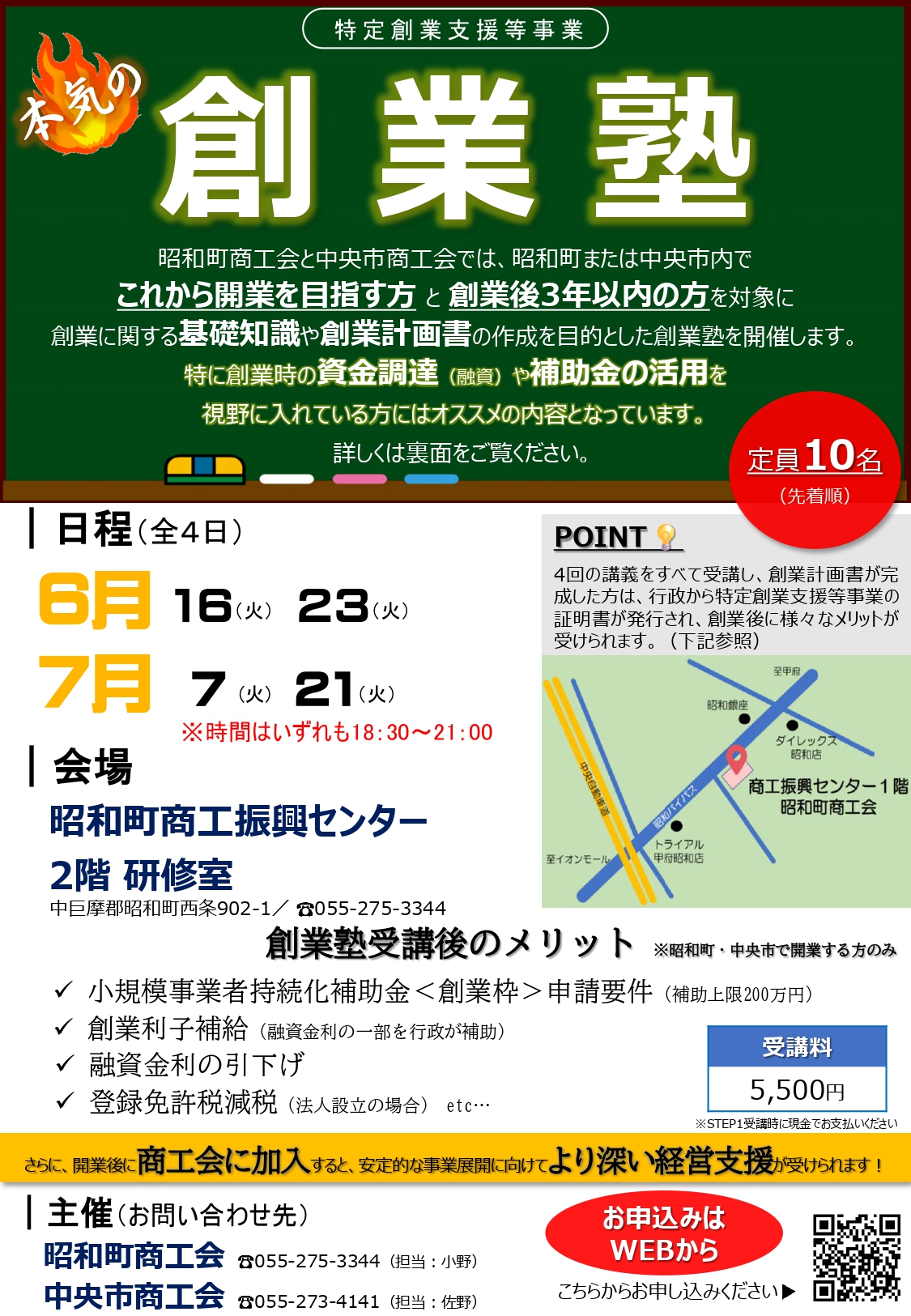 昭和町商工会と中央市商工会では、昭和町または中央市内でこれから開業を目指す方と創業後3年以内の方を対象に創業に関する基礎知識や創業計画書の作成を目的とした創業塾を開催します。